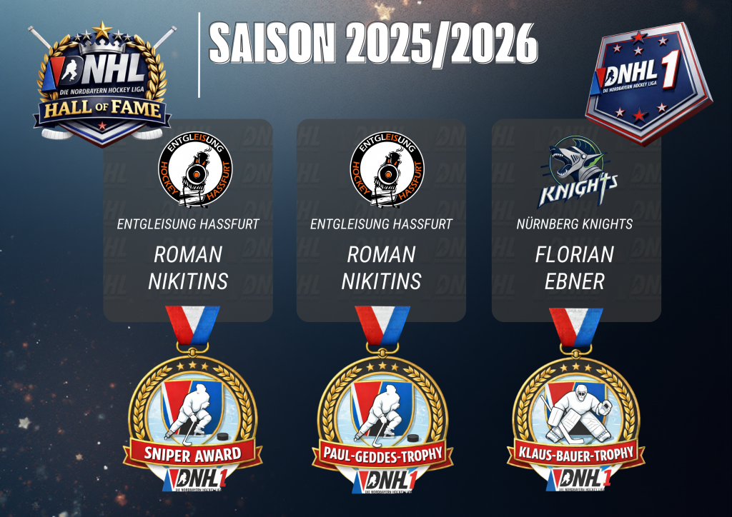 Glückwunsch an Roman Nikitins von Entgleisung Hassfurt und Florian Ebner von den Nürnberg Knights. Roman erhält mit 11 Toren und 19 Assist mit 30 Punkten die Paul-Geddes-Trophy als Top-Scorer sowie den Sniper Award als bester Torschütze der Liga. Florian hat sich als wertvollster Goalie der 1. Liga ausgezeichnet und erhält mit 240 Spielminuten und einen […]