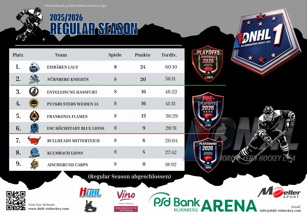 So pünktlich zum Jahreswechsel kann man mal eine kurze Zwischenbilanz ziehen. In Liga 1 haben sich die Eisbären Lauf und die Nürnberg Knights auf den ersten beiden Plätzen in der Tabelle festgesetzt und stehen sicher in den Halbfinalserien. Die Gegner werden die Siegerteams der Pre-Playoffs sein. Für die Plätze 7-9 geht es in den Playdowns […]