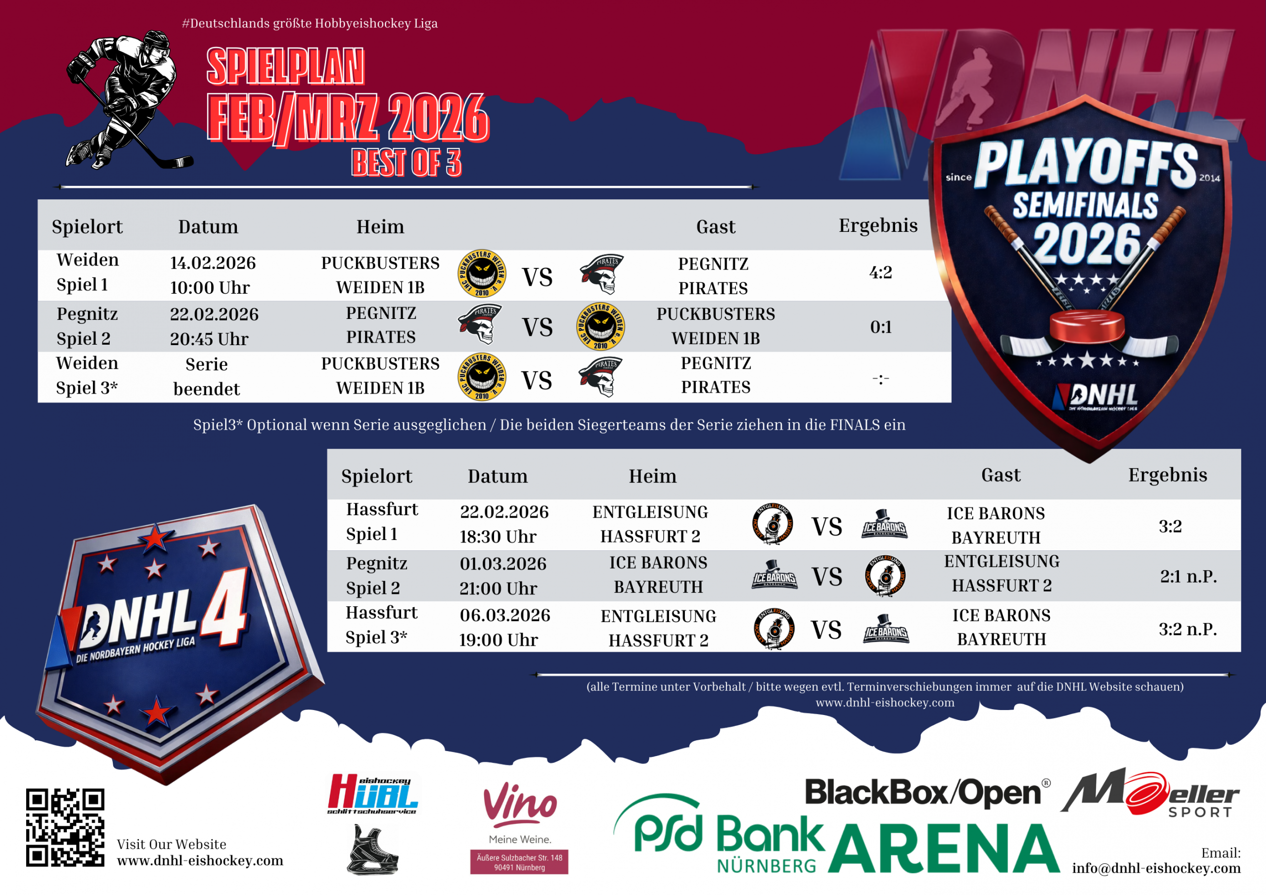 In einem wahren DNHL Playoff Krimi löst die 2. Mannschaft der Entgleisung Hassfurt das Finalticket in der DNHL4. Im ersten Drittel legten die Gastgeber durch die beiden Tore von Dominik Schramm und Hannes Kimmel gleich richtig los und gingen mit 2:0 in Führung. Im 2. Drittel begegneten sich beide Teams auf Augenhöhe. Zahlreiche Chancen auf beiden Seiten zeichneten sich ab aber es fiel kein Tor. Im letzten Spielabschnitt gelang Bayreuth durch Marius Hauenstein zunächst der 1:2 Anschlusstreffer und kurz vor Schluss glich Sebastian Langer die Partie zum 2:2 aus. Im Penaltyschiessen behielten die Unterfranken dann die stärkeren Nerven und konnten die Partie für sich entscheiden. Hassfurt steht im Finale und trifft auf die 2. Mannschaft der Puckbusters aus Weiden. Zum Showdown kommt es am Sonntag den 29.03. um 15:00 Uhr in der Arena Nürnberg. An dieser Stelle noch herzlichen Glückwunsch von uns nach Hassfurt zum Einzug ins Finale 🙂