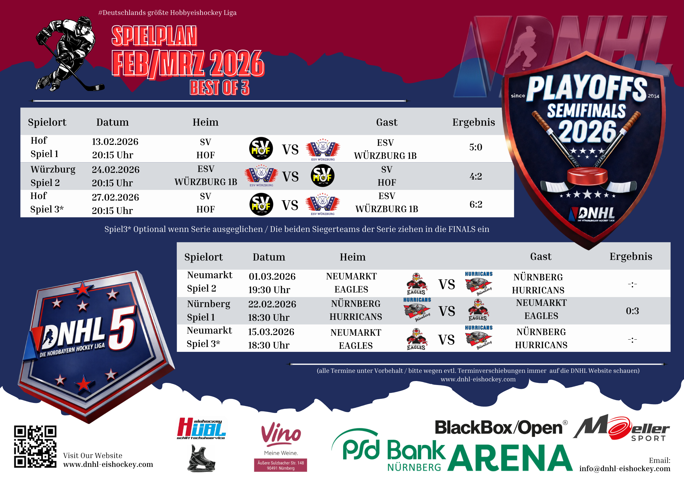 Der SV Hof setzt sich im alles entscheidenden Spiel 3 mit einem 6:2 Sieg gegen den ESV Würzburg 1b durch und steht in den Finals 2026. Im 1. Drittel ging zunächst der ESV Würzburg durch den Treffer von Charly Shepley mit 1:0 in Führung. Kurz drauf glich Hofs Frank Köppel die Partie zum 1:1 aus und kurz vor der Drittelpause ging Hof durch den Treffer von Thomas Wolf mit 2:1 in Führung. Im 2. Spielabschnitt schafften es die Unterfranken die Partie auszugleichen. Alexander Fink netzte zum 2:2 Pausenstand ein. Im letzten Drittel drehte Hof dann auf und legte mit 4 Toren durch Crasser, 2x Siegler und Lassan zum 6:2 Endstand nach. In den Finals treffen die Oberfranken auf die Neumarkt Eagles oder die Nürnberg Hurricans. Glückwunsch auf diesem Wege von uns nach Hof :).
