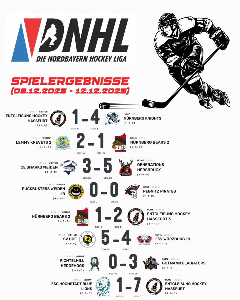 Am Donnerstag waren dann die Ice Sharks aus Weiden zu Gast bei Generations Hersbruck in Nürnberg. Die Ice Sharks gingen zunächst mit 2:0 in Führung bis kurz vor der ersten Drittelpause Generations Hersbruck der Anschlusstreffer zum 2:1 gelang. Nach der Pause netzte dann Hersbruck zum 2:2 Ausgleich ein. Kurz darauf gingen die Ice Sharks aber wieder mit 3:2 in Führung. Im letzten Drittel drehten die Gastgeber dann das Spiel zum 5:3 Endstand. Fazit: Die Zuschauer sahen ein gutes, spannendes und faires Spiel auf Augenhöhe in dem beide Teams den Sieg hätten einfahren können.