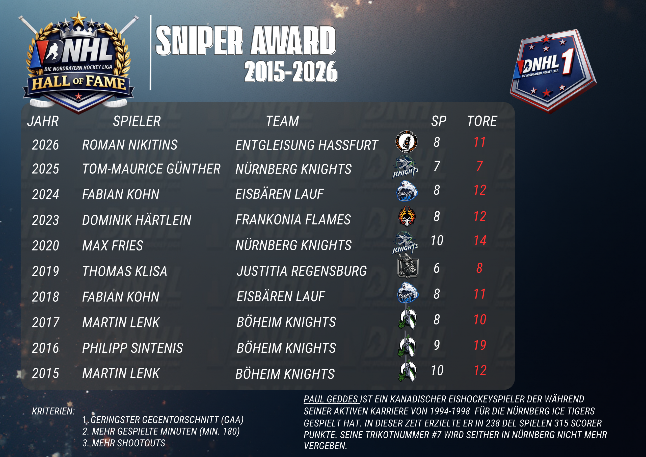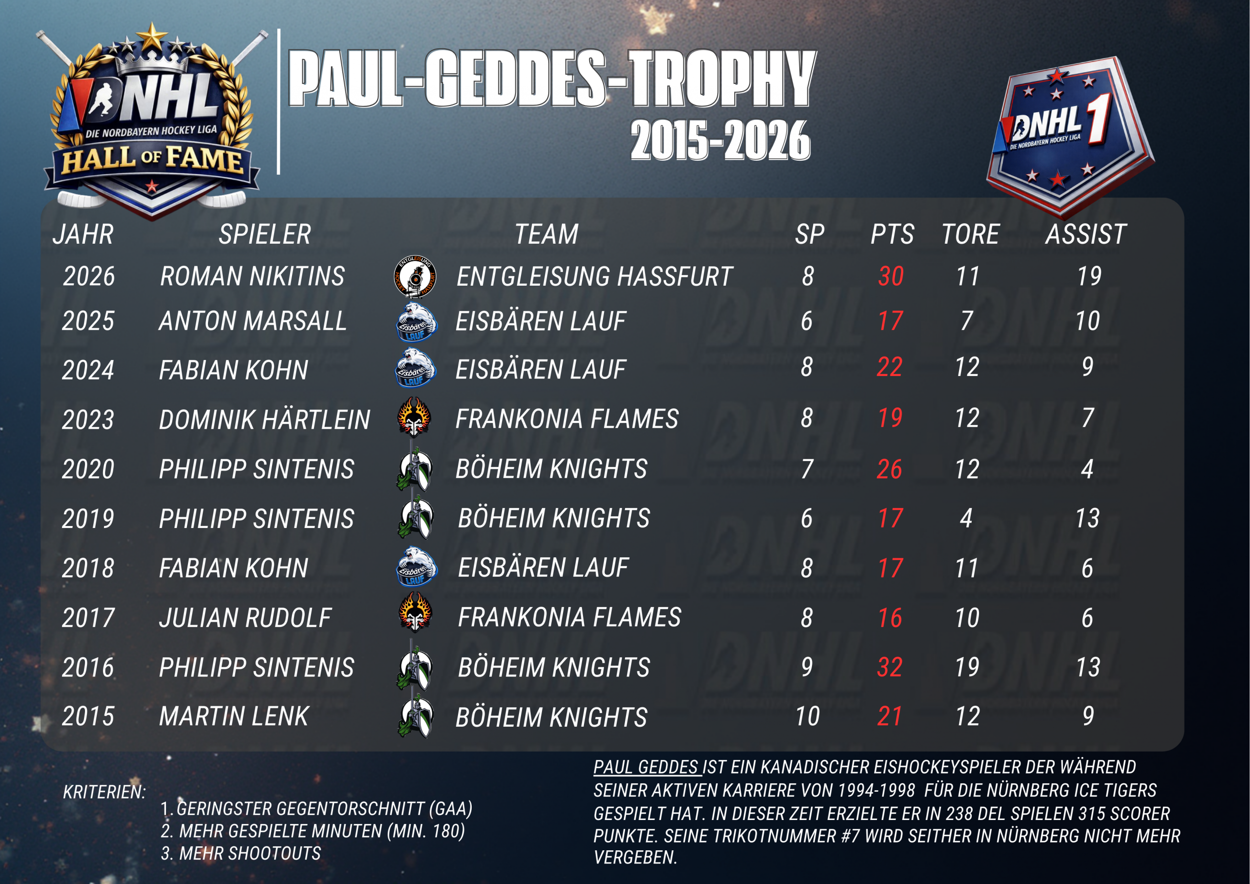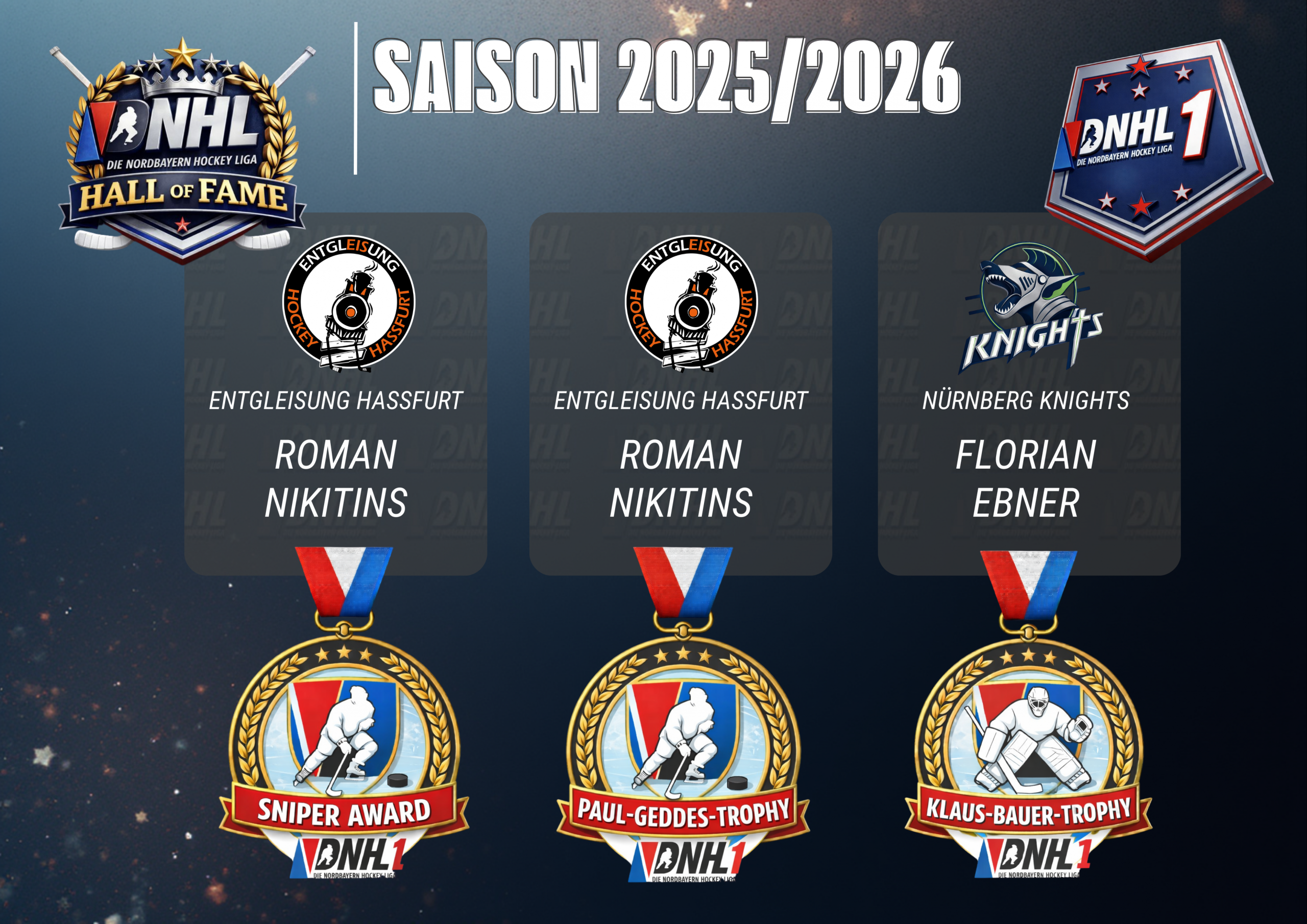 Glückwunsch an Roman Nikitins von Entgleisung Hassfurt und Florian Ebner von den Nürnberg Knights. Roman erhält mit 11 Toren und 19 Assist mit 30 Punkten die Paul-Geddes-Trophy als Top-Scorer sowie den Sniper Award als bester Torschütze der Liga.