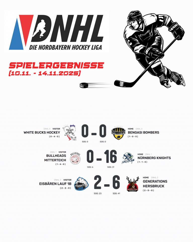 Drei bzw. zwei Spiele fanden unter der Woche statt. Am Montag musste das Spiel der Bengasi Bombers vs White Bucks Hockey kurzfristig abgesagt werden da die White Bucks nicht antreten konnten. Das Spiel wurde mit 5:0 zu Gunsten den Bombers gewertet. Ebenfalls am Montag gelang den Nürnberg Knights gegen die Bullheads aus Mitterteich in Liga 1 ein 16:0 Kantersieg. Die Bullheads mussten leider stark unterbesetzt zum Auswärtsspiel nach Nürnberg reisen. Dies zahlte sich für die Knights im Ergebnis aus die an dem Abend weitestgehend in Bestbesetzung antreten konnten. Und am Donnerstag schlug Generations Hersbruck die 2. Mannschaft der Eisbären Lauf in Liga 2 mit 6:2.