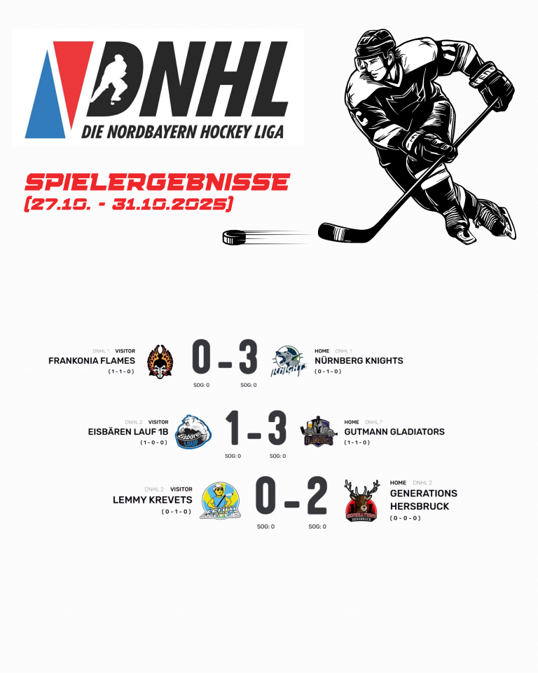 Am Wochenende finden insgesamt 12 DNHL Spiele statt. Unter anderen treffen die Finalisten von Liga 5 Weiher Rats und Buffalos Hockey als Aufsteiger in Liga 4 aufeinander. Ein weiteres Highlight sollte das Höchstädter Derby ESC vs Carps sein und am Sonntag Abend dann der „Klassiker“ Frankonia Flames vs Eisbären Lauf.