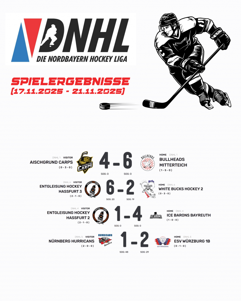 Und in Liga 5 schlägt der ESV Würzburg 1b die Nürnberg Hurricans knapp mit 2:1.